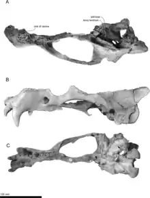 Unlike the modern walrus, Archaeodobenus did not have tusks but instead had canines of moderate size, and looked more like a sea lion.[2] The holotype specimen appears to have been a young adult male of about 3 metres (10 ft) in length, which would have weighed around 473 kg (1,042 lb). This is intermediate between the size of the Steller sea lion and the South American sea lion. Its canines were 86.3 mm (3.4 in) long, compared to modern walrus tusks, which can grow to up to 1 m (3 ft 3 in) long. Archaeodobenus can be distinguished from Pseudotaria by features such as the shape and size of the occipital condyle (which connects with the first neck vertebra at the back of the skull), the foramen magnum (the opening through which the spinal cord passes into the cranium), the mastoid process (where various muscles attach to the back of the skull), and some features in the postcranial skeleton.[1][2][3]