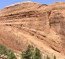 Geological processes that occurred over 300 million years ago caused a salt bed to be deposited, which today lies beneath the landscape of Arches National Park. Over time, the salt bed was covered with sediments that eventually compressed into rock layers that have since been named Entrada Sandstone. Rock layers surrounding the edge of the salt bed continued to erode and shift into vertical sandstone walls called fins. Sand collected between vertical walls of the fins, then slightly acidic rain combined with carbon dioxide in the air allowed for the chemical formation of carbonic acid within the trapped sand. Over time, the carbonic acid dissolved the calcium carbonate that held the sandstone together.[12] Many of the rock formations have weaker layers of rock on bottom that are holding stronger layers on top. The weaker layers would dissolve first, creating openings in the rock. Gravity caused pieces of the stronger rock layer to fall piece by piece into an arch shape. Arches form within rock fins at points of intense fracturing localization, or weak points in the rock's formation, caused by horizontal and vertical discontinuities.[13] Lastly, water, wind, and time continued this erosion process and ultimately created the arches of Arches National Park.[12] All of the arches in the park are made of Entrada Sandstone, however, there are slight differences in how each arch was developed. Entrada Sandstone is categorized into three groups: Slick rock members, Dewey rock members, and Moab members.[14] Vertical arches can be developed from Slick rock members, a combination of Slick rock members and Moab members, or Slick rock members resting above Dewey rock members. Horizontal arches (also called potholes) are formed when a vertical pothole formation meets a horizontal cave, causing a union into a long arch structure. The erosion process within Arches National Park will continue as time continues to pass. Continued erosion combined with vertical and horizontal stress will eventually cause arches to collapse, but still, new arches will continue to form for thousands of years.[15]