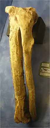 The cnemial crest of Arcovenator's the slender 51-cm tibia is well developed as is characteristic of abelisauroids.[1] It has a proximal lateral condyle more prominent than the medial one, a slight anterodorsal curve on the proximal aspect of the fibular crest, a noticeable distal longitudinal ridge, and tapered malleoli.[1] The nearly half-meter-long fibula possesses the typical anatomical characters of ceratosaurs.[1]
