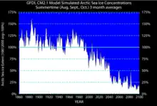 Since 1880, the global temperature has risen 0.8°C; but the temperature in the Arctic has warmed twice as much, leading to much less sea ice coverage and greater accessibility to natural resources, transport passages and fisheries.[1] Between 1971 and 2019 the temperature in the Arctic was three times higher than the increase in the global average during the same period.[2]