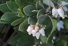 Arctostaphylos nortensis is a shrub up to 5 m (16 ft) tall, bearing racemes of white flowers. It is distinguished from other species in the region by the long hairs on its twigs, flowers and fruits.[4][5]