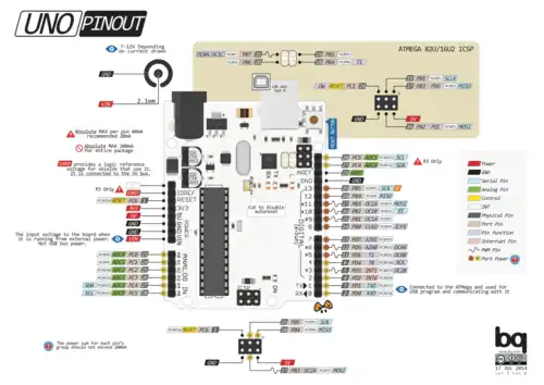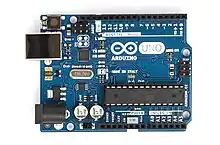 The Arduino Uno is an open-source microcontroller board based on the Microchip ATmega328P microcontroller (MCU) and developed by Arduino.cc and initially released in 2010.[2][3] The microcontroller board is equipped with sets of digital and analog input/output (I/O) pins that may be interfaced to various expansion boards (shields) and other circuits.[1] The board has 14 digital I/O pins (six capable of PWM output), 6 analog I/O pins, and is programmable with the Arduino IDE (Integrated Development Environment), via a type B USB cable.[4] It can be powered by a USB cable or a barrel connector that accepts voltages between 7 and 20 volts, such as a rectangular 9-volt battery. It has the same microcontroller as the Arduino Nano board, and the same headers as the Leonardo board.[5][6] The hardware reference design is distributed under a Creative Commons Attribution Share-Alike 2.5 license and is available on the Arduino website. Layout and production files for some versions of the hardware are also available.