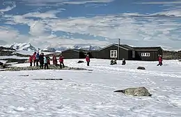 The British Graham Land Expedition under John Riddoch Rymill was based in the Argentine Islands in 1935 and conducted a thorough survey of them.[1] The expedition built a hut on Winter Island, which was used as their northern base; it was left in place at the end of the expedition, but destroyed circa 1946. The following year, the British Falkland Islands Dependencies Survey established a permanent base on the same site, as "Base F" (or "Argentine Islands"); the main building from this base, Wordie House, is now a protected historic site (HSM-62). The base was moved to Galindez Island in 1954, renamed "Faraday" in 1977, and transferred to the Ukrainian Antarctic program in 1996, who continue to operate it as Vernadsky Research Base.[2]
