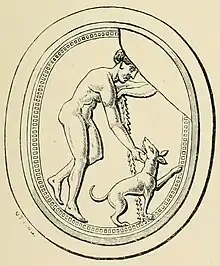 ![]() Odysseus leaning on his pilgrim's staff, and recognised by his old dog, Argos (Early Greek intaglio, on a chalcedony scarabaeoid) | |