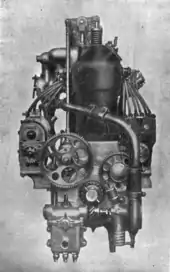The two magnetos were mounted with their shafts in parallel to the engine, with one magneto placed on either side at the control end. The magnetos were driven via spur gears from the camshaft gear and from the crankshaft via an intermediate idler gear respectively.