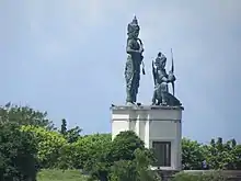 Arjuna inadvertently broke the pact with his brothers, intruding as he sought to collect weapons whilst Yudhishthira, was alone with Draupadi. He felt obliged to go into exile despite Yudhishthira's attempts to dissuade him.[27] It was this event that led to him forming a close relationship with his cousin Krishna[lower-alpha 1] because he ignored the celibacy condition of the pact[25] and married three people on his travels, the first of whom was a Naga princess named Ulupi, with whom he had a son called Iravan. His second marriage was with a princess of Manipura, Chitrangada, who bore a son named Babhruvahana. The third was with Subhadra, the sister of Krishna. This last event, which took place in Dvaraka,[27] is not the first meeting between Krishna and the Pandavas in the story but it does mark the start of a bond, sealed with the birth of the couple's child, Abhimanyu, whom Krishna adores.[31]