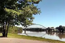 Upon entering Prairie County, Highway 38 continues to pass through rural, agricultural areas with small settlements at intersections with other state highways. The highway intersects Highway 13 at Hickory Plains, Highway 86 at Hayley, and Highway 11 at Four Mile Corner. Highway 11 begins a concurrency with Highway 38 eastward toward Des Arc, the county seat for the northern district of Prairie County.[a 1] Entering Des Arc, Highway 38 and Highway 11 intersect Highway 323 near the Lower White River Museum State Park. Highway 323 runs to the downtown business district, with Highway 38 turning northeast and bypassing most of the city. In northern Des Arc, the concurrency with Highway 11 ends, with Highway 11 turning due north toward the Bayou De View Wildlife Management Area and Searcy. This intersection also contains Highway 323Y, which is a short spur route providing access to downtown Des Arc. Highway 38 continues along the northern edge of Des Arc, passing the historic Oak Grove Cemetery, listed on the NRHP, and crossing over the White River on a 1970 steel through truss bridge. Highway 33 overlaps Highway 38 in eastern Prairie County until the Woodruff County line, when Highway 33 turns north toward Augusta, ending the concurrency.[a 2][9]