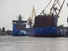 While the hull of the icebreaker was still being assembled on the slipway, the shipyard began the construction of the 2,400-tonne (2,400-long-ton) superstructure that would be installed after launching.[28] Similarly, the 180-tonne (180-long-ton) RITM-200 nuclear reactors were installed after launching: the first one on 2 September 2016 and the second one on 21 September.[29]