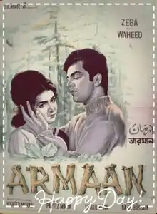 Armaan (Urdu: ارمان) is a 1966 Pakistani black-and-white film produced by Waheed Murad and directed by Pervez Malik. It was the first Pakistani film to complete 75 weeks in cinemas and, thus, became the first Pakistani (Urdu) "Platinum Jubilee" film. The film was picturized in black-and-white prints in Karachi. It starred Waheed Murad and Zeba in leading roles.[1][2]