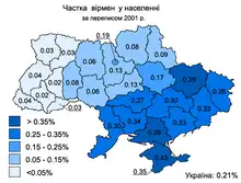 Many Armenians living in Ukraine have been Russified with about half speaking Armenian as their mother tongue but over 43% speaking Russian and only 6% Ukrainian.[9]