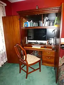 An armoire desk is a writing-table built within a large cabinet, usually 1.5–2.0 metres (5–7 feet) high. The cabinet is closed by two to four full-height doors, to keep out dust or to give a tidy appearance to a room by hiding the cluttered working surface of the desk. This form of desk is usually placed against a wall, like its antique uncle, the secretary desk.