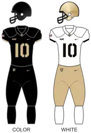 Army's football program began on November 29, 1890, when Navy challenged the cadets to a game of the relatively new sport. Navy defeated Army at West Point that year, but Army avenged the loss in Annapolis the following year.[4] The academies still clash every December in what is traditionally the last regular-season Division I college-football game. The 2016 Army–Navy Game marked Army's first recent win after fourteen consecutive losses to Navy. From 1944 to 1950, the Cadets had 57 wins, 3 losses and 4 ties. During this time span, Army won three national championships.[5]