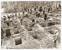![]() German locals from Suttrop dig graves for the bodies of 57 Russians, including women and one baby, exhumed from a mass grave nearby. | |