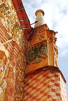 The Concá mission is the smallest of the five, but between 1754 and 1758 by José Antonio de Murguía and Joaquin Fernández Osorio. It is dedicated to the Archangel Michael, with the theme of the facade being “The Victory of the Faith.”[17] It is considered to have the most indigenous elements,[7][16] with many of its elements showing the more brusque work characteristic of indigenous decoration. More obvious is an image of the Holy Trinity at the crest, which is accompanied by a rabbit and a two-headed eagle, which are Pame symbols.[7][16] Also prominent are the coat of arms of the Franciscan order, grapevines, two headed eagles, with the Virgin of Guadalupe and Our Lady of the Pillar, the patronesses of Mexico and Spain respectively.[17]
