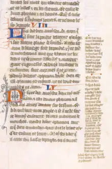 Marginal glosses accompany the biblical text in manuscripts N and C. In the Occitan version, N2, they have been incorporated into the text, albeit marked off by red lines or special letters. There are no glosses in the Arsenal copy, but they were part of the original compilation.[3]