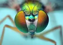 Most arthropods have at least one of two types of eye: lateral compound eyes, and smaller median ocelli, which are simple eyes.[2] When both are present, the two eye types are used in concert because each has its own advantage.[3] Some insect larvae, e.g., caterpillars, have a different type of simple eye known as stemmata. These eyes usually provide only a rough image, but (as in sawfly larvae) they can possess resolving powers of 4 degrees of arc, be polarization sensitive and capable of increasing their absolute sensitivity at night by a factor of 1,000 or more.[4] Flying insects can remain level with either type of eye surgically removed, but the two types combine to give better performance.[3] Ocelli can detect lower light levels,[lower-alpha 1][5] and have a faster response time, while compound eyes are better at detecting edges and are capable of forming images.[3]