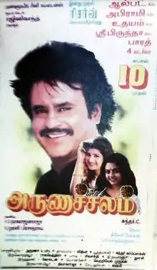 The film was released theatrically on 10 April 1997.[9] The Hindu wrote on 18 April, "Arunachalam contains all the elements that provide escapist entertainment [...] humour, fairplay, love, feud occupy the frames".[10] K. N. Vijiyan of New Straits Times wrote, "Go with an open mind and you will enjoy this movie".[11] R. P. R. of Kalki gave a negative review panning weak screenplay, many of the montage shots after interval in bits and pieces, Crazy Mohan's dialogues lacking humour, Deva's music though he praised Rajinikanth's acting for rescuing the film but the technicians seems to have let him down and concluded Arunachalam did not do it despite the Lord saying that he should give great happiness to the fans in this Tamil New Year.[12] The film was declared a box office success, although not as big as Rajinikanth's previous films Baashha and Muthu (both 1995).[13][14] It had a theatrical run of over 175 days and collected around ₹32 crore (equivalent to ₹163 crore or US$20 million in 2023) worldwide.[15]