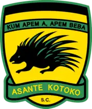 The foundation of Kumasi Asante Kotoko Sporting Club was laid by 13 young Ashanti men led by a young driver, Mr. Kwasi Kumah, ably supported by L.Y. Asamoah an electrician.[3][4] Mr. Kwasi Kumah, a native of Nyankyerenease near Kumasi in the Ashanti Region, was a chauffeur to an English man and military officer, a Colonel Ross.[3][4] Kwasi Kumah nurtured the idea of forming a football team when he watched an exciting football match.[3][4] When Colonel Ross returned home for good, Kumah bought a set of jerseys to start his football team.[3][4] With co-operation from his good friend, L.Y.Asamoah, he formed the Ashanti United Football Club in 1926.[3][4] Five years later the team was renamed Kumasi Titanics.[3][4] The team was really handicapped because most of the players worked in government organizations like the Prisons and Railways and had been transferred from Kumasi.[3][4] "Kumasi Titanics" did not find enough luck in their new name and in 1934 they adopted a more powerful name, Mighty Atoms.[3][4] Still the club did not see much progress and in 1935, Mr J.S.K. Frimpong, popularly called Teacher Frimpong, then a teacher of the Kumasi Government School who had all the time shown interest in the club, organized some men from his school and proposed a change of name from "Kumasi Titanics" to Kumasi Asante Kotoko Football Club.[3][4] Permission had to be obtained from the Asantehene (King of the Kingdom of Ashanti) because the name "Kotoko", meaning "Porcupine" is the official symbol of the Ashanti nation.[3] The Asantehene, Nana Sir Osei Agyeman Prempeh II, became the first life patron of the club.[3] Kumasi Asante Kotoko Football Club was subsequently formally founded in 1935.[3][4]