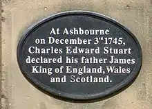 The site currently occupied by the town hall was previously the location of the Talbot Inn, a public house which dated back at least to the early 17th century.[2] The inn was the venue for the examination of witnesses in a legal case heard in January 1639 in which Sir Andrew Kniveton claimed he had been libelled by William Greaves.[3] A visit by two travellers to the Talbot Inn was described by Izaak Walton in his book The Compleat Angler, first published in 1653,[4] and, it was in the Market Place, outside the inn, that Charles Edward Stuart declared his father, James Francis Edward Stuart, King of England, Wales and Scotland, while passing through Ashbourne in December 1745 during the Jacobite rising.[5]