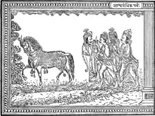 The escort had to prevent the stallion from mating with any mares during its journey, and if he did, an oblation of milk was performed to Vāyu. If the horse became ill with injury, an oblation of pap to Pūṣan. If he became ill without injury, then an oblation of cake to Agni Vaiśvānara. If he was afflicted with eye disease, an oblation to Sūrya. If the horse drowned, an oblation was performed to Varuṇa. If the horse was lost, an oblation of cake, potsherd, and three other dishes to the deities of heaven and earth, along with an oblation of milk to Vāyu and pap to Sūrya. If the horse died, then another was selected and consecrated to replace it.[14] During the absence of the horse, an uninterrupted series of ceremonies was performed in the sacrificer's home. Every day, three Sāvitreṣṭi rites and one evening Dhṛtihoma would be conducted by the priests. In the evening after the Dhṛtihoma, two Brahmin and two Kshatriya bards and lutists would praise the patron king's generosity, who gave 4,000 cows and 400 gold coins to the priests on the first day of the sacrifice. Then a session of pariplavākhyāna took place.[15] The pariplāvana was the cyclical recitation of tales, in which one out of ten topics would be discussed each night, with 36 cycles of the ten topics.[16] The tales were witnessed by an audience of onlookers called the upadrāṣṭṛ, who attended in their free time.[17]