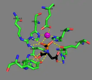 The zinc cofactor is found at the active site and is held by Glu-24, His-21, and His 116.[13] The substrate is held in place by Arg-63, Asn-70, Arg-71, Tyr-164, Arg-168, and Tyr-288.[5] The zinc cofactor is used to lower the pKa of a ligated water molecule so that an attack on N-acetyl-L-aspartate may occur and to stabilize the resulting tetrahedral intermediate along with Arg-63, and Glu-178.[13]