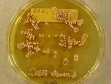 Aspergillus alabamensis produces slow growing colonies that are wooly and white becoming yellow-brown to cinnamon-brown in colour with the onset of asexual sporulation.[2] Conidiophores are colourless and smooth with densely columnar conidial heads 30–50 μm in diameter and 150–500 μm in length.[2] The vesicles are subglobose with a diameter of 10–16 μm.[2] The metulae attached to the vesicles are closely packed, measuring 5.5–7.5 μm long by 1.5–2.0 μm wide.[2] Phialides attached to the apices of the metulae are 5.0–7.0 μm long by 2.0–2.5 μm wide.[2] The conidia arising from the tips of the phialides are slightly elliptical and smooth-walled reaching a diameter of 1.8–2.4 μm.[2] While Aspergillus alabamensis can grow between 25–50 °C, its optimal growth temperature is 37 °C.[2][8] A. alabamensis can grow in vitro on a range of growth media including potato flake agar,[8] carnation leaf agar,[8] Czapek's yeast autolysate agar,[2] and malt extract agar.[2] This species is able to utilize glucose and sucrose as sources of carbon.
