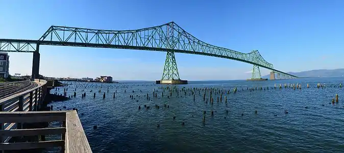 The bridge is 14 miles (23 km) from the mouth of the river at the Pacific Ocean. The bridge is four miles (6.5 km) in length,[3] and was the final segment of U.S. Route 101 to be completed between Olympia, Washington, and Los Angeles, California.[4]