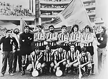 Both clubs fielded teams of a single nationality in the showpiece first leg at the Stadio Comunale on 4 May before a 75,000 crowd, with the only goal scored by the hosts' Marco Tardelli.[44][46][60][61] In the return on 18 May, an early away goal by Juve's Roberto Bettega left Athletic with a tough task to score three against the side that were about to be crowned Serie A champions, had only conceded 20 goals in the league and given up just one to each of their UEFA Cup opponents that season.[62] Athletic quickly equalised on the night through Irureta, but could not find another goal until Carlos scored the second on 78 minutes. A frantic last portion of the match failed to produce the vital third goal, the tie finished 2–2 and Juventus claimed their first European trophy on the away goals rule.[44][46][61][63] A few weeks later, Athletic suffered further disappointment when they lost the 1977 Copa del Rey Final in a penalty shoot–out to Real Betis.[64]
