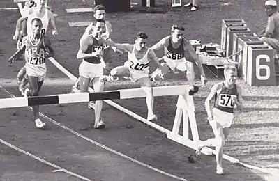 3000 m steeplechase final. Sokolov (#570, URS) is in the lead, chased by Roelants (#242, BEL), Rzhishchin (#568, URS) and Konov (URS). Jones (#420, USA) is on the left