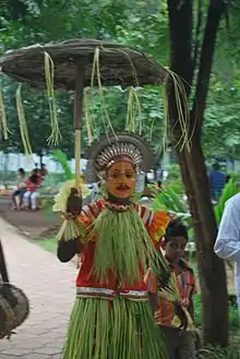 The costume differs by region, In Sullia, Aati Kalenja dancer wears a face mask which is made from the spathe of an areca nut branch. [4]