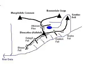 The Northern Fells make up a roughly circular upland area about 10 miles (16 km) wide. At the centre is the marshy depression of Skiddaw Forest a treeless plateau at an altitude of 1,300 ft (400 m) and flowing outward from here are the rivers which divide the area into three sectors. Between the Glenderaterra Beck and the River Caldew, the southeastern sector contains Blencathra and its satellites.[4]