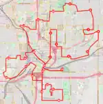 The 2019 course starts at ends at Centennial Olympic Park and, over 26 miles 385 yards (42.195 km) of city roads, includes many landmarks, such as Georgia State University, Martin Luther King Jr. National Historical Park, Edgewood Avenue, Inman Park, Little Five Points, Virginia–Highland, Piedmont Park, Georgia Institute of Technology, Mercedes-Benz Stadium, Morris Brown College, Morehouse College, Clark Atlanta University, Spelman College, 1996 Olympic rings, Georgia State Stadium, Grant Park and Zoo Atlanta, Cheney Stadium, Georgia State Capitol, and Oakland Cemetery.