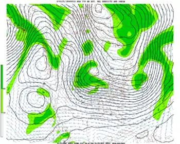 Blocks in meteorology are large-scale patterns in the atmospheric pressure field that are nearly stationary, effectively "blocking" or redirecting migratory cyclones. They are also known as blocking highs or blocking anticyclones.[1] These blocks can remain in place for several days or even weeks, causing the areas affected by them to have the same kind of weather for an extended period of time (e.g. precipitation for some areas, clear skies for others).[2] In the Northern Hemisphere, extended blocking occurs most frequently in the spring over the eastern Pacific and Atlantic Oceans.[1] Whilst these events are linked to the occurrence of extreme weather events such as heat waves,[3] particularly the onset and decay of these events is still not well captured in numerical weather forecasts and remains an open area of research.[4][5]