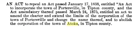 March 19, 1883 - corporation of the town of Atoka repealed.