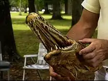 On September 4, 2009, a 3 ft 3 in (0.99 m) alligator gar was found in Tak Wah Park in Tsuen Wan, Hong Kong. Over the next two days, at least 16 other alligator gar, the largest measuring 4.9 ft (1.5 m), were found in ponds within public parks in Hong Kong.[35] Nearby residents reported the alligator gar had been released into the ponds by aquarium hobbyists, and had lived there for several years. However, after a complaint made by a citizen who falsely identified alligator gar as crocodiles, the use of terms like "horrible man-eating fish" had begun appearing in the headlines of some major local newspapers. Officials with Leisure and Cultural Services in Tak Wah Park removed all the alligator gar from the ponds because they were concerned the large, carnivorous fish might harm children.[36] Not unusually, the large, sharp teeth and outward appearance of alligator gar can precipitate unreasonable fear in those unfamiliar with the species. Sensationalized reports have contributed to the misconception of predatory attacks by alligator gar on humans, though none of the reports have been confirmed.