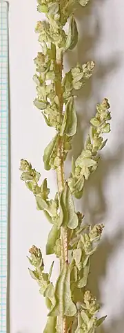 Atriplex truncata is an annual herb producing erect, angled stems which can be higher than 70 centimeters. Leaves are 1 to 4 centimeters long and wedge-shaped. The stems and herbage are generally very scaly and scurfy. Male and female flowers are produced in small clusters in the leaf axils.