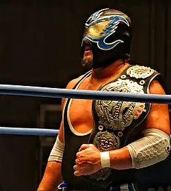 On January 26, 2013, Aoki, Go Shiozaki, Jun Akiyama, Kotaro Suzuki and Yoshinobu Kanemaru, all of whom had quit Noah at the same time, announced that they had joined All Japan Pro Wrestling, forming the "Burning" stable.[26] Aoki and Suzuki received their first shot at the All Asia Tag Team Championship on March 17, but were defeated by the defending champions, Koji Kanemoto and Minoru Tanaka.[27] On April 7, Aoki and Suzuki defeated Hikaru Sato and Hiroshi Yamato to win the 2013 Junior Hyper Tag League and earn another shot at Kanemoto and Tanaka.[28] On April 25, Aoki and Suzuki defeated Kanemoto and Tanaka in a rematch to become the new All Asia Tag Team Champions.[29] On May 11, Aoki made a one night return to Noah to take part in Kenta Kobashi's retirement event, Final Burning in Budokan, during which he and Suzuki defeated Kentaro Shiga and Tamon Honda in a tag team match.[30] On July 5, following a mass exodus led by Keiji Mutoh, it was announced that Aoki, along with the rest of Burning, had signed an exclusive contract with All Japan.[31] On October 29, Aoki and Suzuki quit Burning in order for Suzuki to challenge Kanemaru for the World Junior Heavyweight Championship.[32][33] On November 21, Aoki and Suzuki, along with Kento Miyahara, joined Go Shiozaki's new Xceed stable.[34] On January 26, 2014, Aoki and Suzuki lost the All Asia Tag Team Championship to former Burning stablemates Jun Akiyama and Yoshinobu Kanemaru.[35] On February 5, Aoki announced he was quitting Xceed to go solo.[36] On May 29, Aoki defeated Último Dragón to become the new World Junior Heavyweight Champion.[37] On July 27, Aoki joined the Evolution stable, after a successful title defense against one of its members, Hikaru Sato.[38] In October, Aoki and Sato won the 2014 Jr. Tag Battle of Glory.[39] On March 27, 2015, Aoki lost the World Junior Heavyweight Championship to Kotaro Suzuki.[40] On October 23, Aoki and Hikaru Sato won their second Jr. Tag Battle of Glory in a row by winning the round-robin tournament with a record of three wins and one loss.[41][42] On January 1, 2016, Aoki was appointed the president of talent relations.[43] On February 21, 2016, Aoki defeated tag team partner Hikaru Sato in the finals to win the 2016 Jr. Battle of Glory and the vacant World Junior Heavyweight Championship.[44] He went on to lose the title to Sato on June 19.[45] On July 24, Aoki and Sato defeated Isami Kodaka and Yuko Miyamoto to win the All Asia Tag Team Championship.[46] On November 17, Aoki and Sato won their third Jr. Tag Battle of Glory in a row by defeating Soma Takao and Yuma Aoyagi in a playoff match.[47] On November 27, Aoki and Sato lost the All Asia Tag Team Championship to Atsushi Onita and Masanobu Fuchi.[48] Aoki and Sato regained the title from Onita and Fuchi on June 20, 2017.[49] They lost the title to Black Tiger VII and Taka Michinoku on August 27.[50] In early 2018, still using his birth name, Aoki began working under a mask and regained the World Junior Heavyweight Championship from Tajiri on February 3 in Yokohama.[51] Aoki held the title until August, when he dropped it to Koji Iwamoto.[51] In April 2019, Aoki competed in the Champion Carnival once again as a last minute replacement for Kengo Mashimo. Aoki competed in A Block and managed to finish with 8 points, but was unable to advance to the final.[52] Aoki regained the World Junior Heavyweight Championship for the fourth time on May 20, 2019, defeating Iwamoto. His last match took place on June 2, teaming with Hikaru Sato and Yusuke Okada in a loss to Jake Lee, Koji Iwamoto, and Nobe Bryant. At the time of his death, Aoki was scheduled to defend his title against Hikaru Sato on June 18. Despite his death, AJPW announced he would be recognized as champion until November 2019, allowing his 6 month defence clause to expire before crowning a new champion.