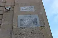 The main entrance is approached by a flight of steps, and the doorway is flanked by columns which support a trophy of arms and a bronze bust of Grand Master Manuel Pinto da Fonseca.[15][16] A moulded window is located above the bust, and it is surmounted by Pinto's coat of arms.[17] The centrepiece above the window bears the coats of arms of Castile and León and of Portugal.[2] Just in front of the entrance are two historic canons, now used for decoration.[18][19]