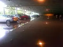 Daily rainfall records were broken in Detroit, Flint, and Saginaw, with Detroit recording its second-heaviest rainfall event on August 11, where 4.57 inches (116 mm) of rain fell at Detroit Metropolitan Airport.[4][5][6] Vehicles were submerged on portions of Interstate 696 and Interstate 75.[6] In suburban portions of Detroit, peak rainfall amounts of 6.25 inches (159 mm) were recorded.[7] The American Automobile Association received over 700 calls for assistance in 12 hours, and heavy rainfall caused river levels to rise.[8] At Baker College near Allen Park, floods stranded 60 students and forced a portion of Interstate 94 to close.[9] Detroit Zoo closed as a result of flood damage there.[8] 32,000 power outages occurred during the flood event, and flood damage totaled $1.8 billion.[6][10]