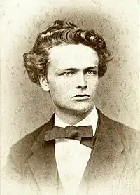 Taking his cue from William Shakespeare, he began to use colloquial and realistic speech in his historical dramas, which challenged the convention that they should be written in stately verse. During the Christmas holiday of 1870–71, he re-wrote a historical tragedy, Sven the Sacrificer, as a one-act play in prose called The Outlaw.[39][42] Depressed by Uppsala, he stayed in Stockholm, returning to the university in April to pass an exam in Latin and in June to defend his thesis on Adam Gottlob Oehlenschläger's Romantic tragedy Earl Haakon (1802).[43] Following further revision in the summer, The Outlaw opened at the Royal Theatre on 16 October 1871.[39][44][45] Despite hostile reviews, the play earned him an audience with King Charles XV, who supported his studies with a payment of 200 riksdaler.[46] Towards the end of the year Strindberg completed a first draft of his first major work, a play about Olaus Petri called Master Olof.[39][47] In September 1872, the Royal Theatre rejected it, leading to decades of rewrites, bitterness, and a contempt for official institutions.[48][49] Returning to the university for what would be his final term in the spring, he left on 2 March 1872, without graduating.[50] In Town and Gown (1877), a collection of short stories describing student life, he ridiculed Uppsala and its professors.[51][52][53]