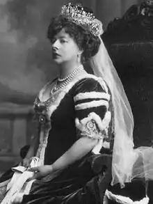 Florence, Lady Poltimore, had a diamond tiara made for her by Garrards of London in the 1870s, later known as the Poltimore Tiara. It was sold at auction by the 4th Baron for £5,500. It was made famous after having been worn by Princess Margaret at her wedding in 1960 in Westminster Abbey, having been purchased for her shortly beforehand. After the Princess's death, it was sold at auction in 2006 at Christie's, by her children, Viscount Linley and Lady Sarah Chatto,[5] for £926,400 ($1,704,576). It can be converted into a necklace and brooches.[6]