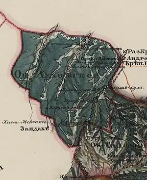 After the end of the Caucasian War, at the place of residence of the Aukhites, for some time there was an administrative unit - the Aukh District. On October 1 , 1862, the Upland District of the Terek Region was formed, which included the Aukh, Salatov and Zandak districts.[4][5]