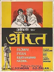 Aurat (lit. 'Woman') is a 1967 Indian Hindi-language film produced and directed by S. S. Balan and S. S. Vasan. It is a remake of the 1966 Tamil film Chitthi. It stars Padmini, Feroz Khan, Rajesh Khanna, Pran, Nazima, O. P. Ralhan in pivotal roles, along with Kanhaiyalal, David, Lalita Pawar, Leela Chitnis in supporting roles. The film's music is by Ravi. The film is totally revolving around the character of Parvati's life. The film deals with how Parvati (played by Padmini), who is in true love with Anand (Feroz Khan), is forced by circumstances to marry Manoharlal (Pran) against wishes of her brother Suresh (Rajesh Khanna) and later is tested by life to show whether after marriage to Manoharlal, she is truly affectionate to Manoharlal.
