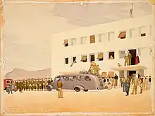 In the meantime, the New Zealand Government was considering appointing an official war artist to record the exploits of New Zealanders serving with the military. Deans had already been interviewed for the position the previous year and his application was supported by many in New Zealand, particularly from the Canterbury region. His mother even wrote to the Prime Minister Peter Fraser advocating for her son. Deans had been interviewed by the commander of 2NZEF, Major General Bernard Freyberg, the previous year but the position would eventually go to Peter McIntyre.[11] However, shortly after Deans' arrival on Crete, he was told that he had been appointed assistant war artist. His first task was to paint depictions of New Zealanders serving in Greece, as McIntyre had not been present for that campaign. Although he was offered the opportunity to return to Egypt to start his work there, he preferred to remain on Crete.[12] He was therefore caught up in the invasion that commenced on 20 May 1941. Paintings already worked up by that stage were in transit to Egypt and would duly arrive in New Zealand. In the meantime, Deans was badly wounded; he had inadvertently set off a land mine and had to be hospitalised with his legs full of shrapnel.[13] A few days later, and unable to be evacuated, he was one of 520 wounded New Zealanders to be captured by the Germans.[14]