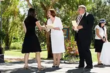 Prime Minister Julia Gillard and Secretary of the Department of Immigration and Citizenship Andrew Metcalfe with a new citizen at a 2011 citizenship ceremony