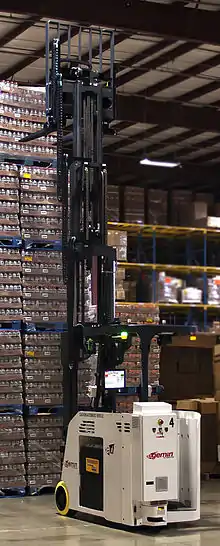 Automatic loading of trailers is a relatively new application for automated guided vehicles and becoming increasingly popular. AGVs are used to transport and load pallets of finished goods directly into standard, over-the-road trailers without any special dock equipment. AGVs can pick up pallets from conveyors, racking, or staging lanes and deliver them into the trailer in the specified loading pattern.[14] Some Automatic Trailer Loading AGVs utilize Natural Targeting to view the walls of the trailer for navigation. These types of ATL AGVs can be either completely driverless or hybrid vehicles.[15]