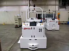 To help an AGV navigate it can use three different steer control systems.[6] The differential speed control is the most common. In this method there are two independent drive wheels. Each drive is driven at different speeds in order to turn or the same speed to allow the AGV to go forwards or backwards. The AGV turns in a similar fashion to a tank. This method of steering is the simplest as it does not require additional steering motors and mechanism. More often than not, this is seen on an AGV that is used to transport and turn in tight spaces or when the AGV is working near machines. This setup for the wheels is not used in towing applications because the AGV would cause the trailer to jackknife when it turned.
