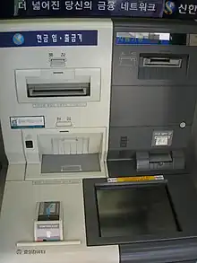 ATMs are known by a variety of names, including automatic teller machines (ATM) in the United States[1][2][3] (sometimes redundantly as "ATM machine"). In Canada, the term automated banking machine (ABM) is also used,[4][5] although ATM is also very commonly used in Canada, with many Canadian organizations using ATM over ABM.[6][7][8] In British English, the terms cashpoint, cash machine and hole in the wall are most widely used.[9] Other terms include any time money, cashline, tyme machine, cash dispenser, cash corner, bankomat, or bancomat. ATMs that are not operated by a financial institution are known as "white-label" ATMs.