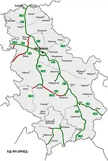 Over 300 kilometers of new motorways have been constructed in the last decade and an additional 188 kilometres (117 mi) are currently under construction including: A5 motorway (from Pojate to Preljina);[5] a 39 km (24 mi)-long segment of A2 (between Čačak and Požega);[6][7] an 18 km (11 mi) section between Kuzmin and Sremska Rača.[8]