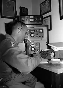 Corporal Jarratt, a WAAAF telegraphist operating Medium Frequency Direction/Finding (MFD/F) equipment at VAOC Headquarters at Victoria Barracks.